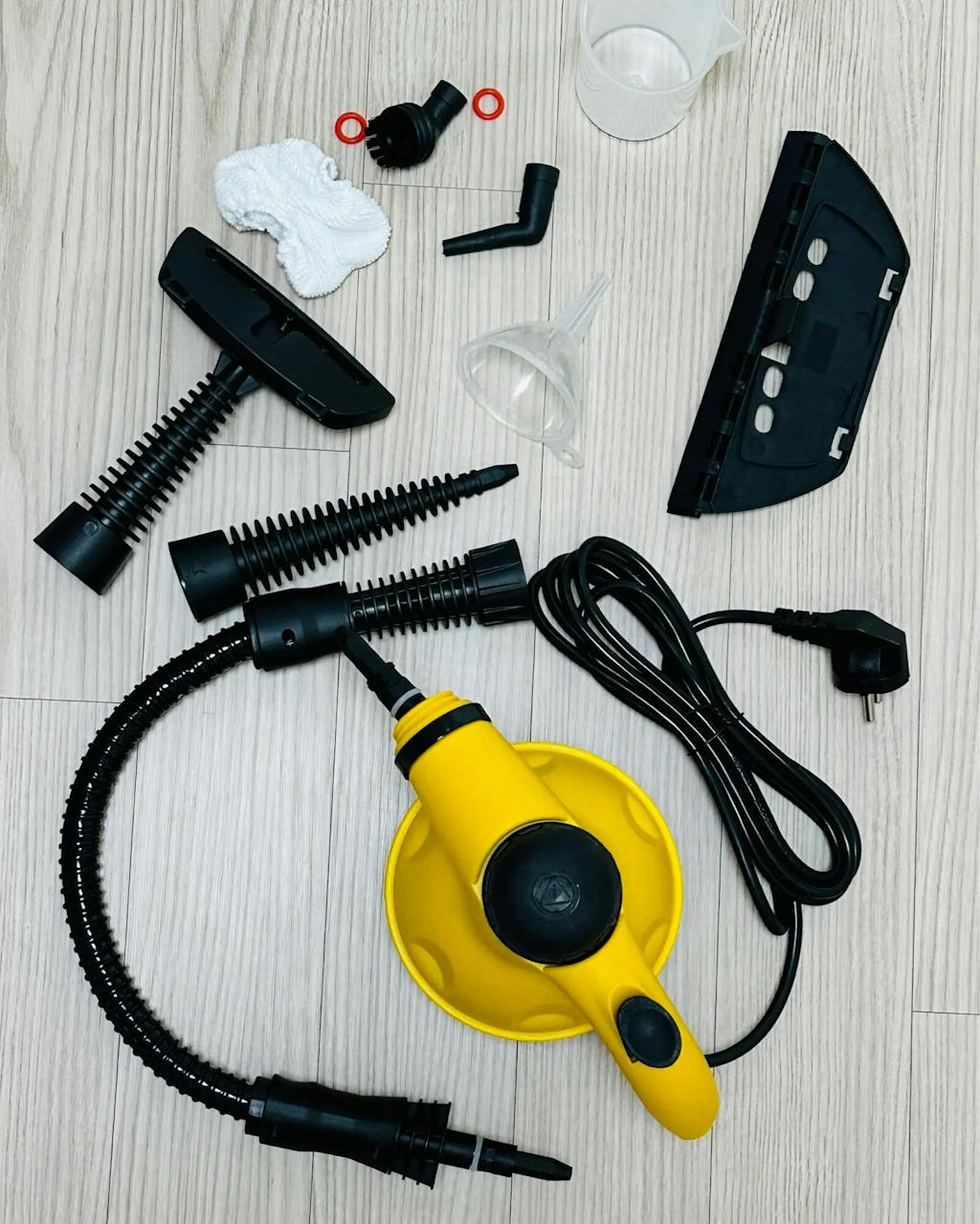 Incluye un kit de 9 accesorios, como boquillas extendidas, cepillos, adaptadores y una taza rociadora para ventanas. Cada accesorio está diseñado para facilitar la limpieza de diferentes superficies, desde juntas estrechas hasta vidrios y tapicerías.